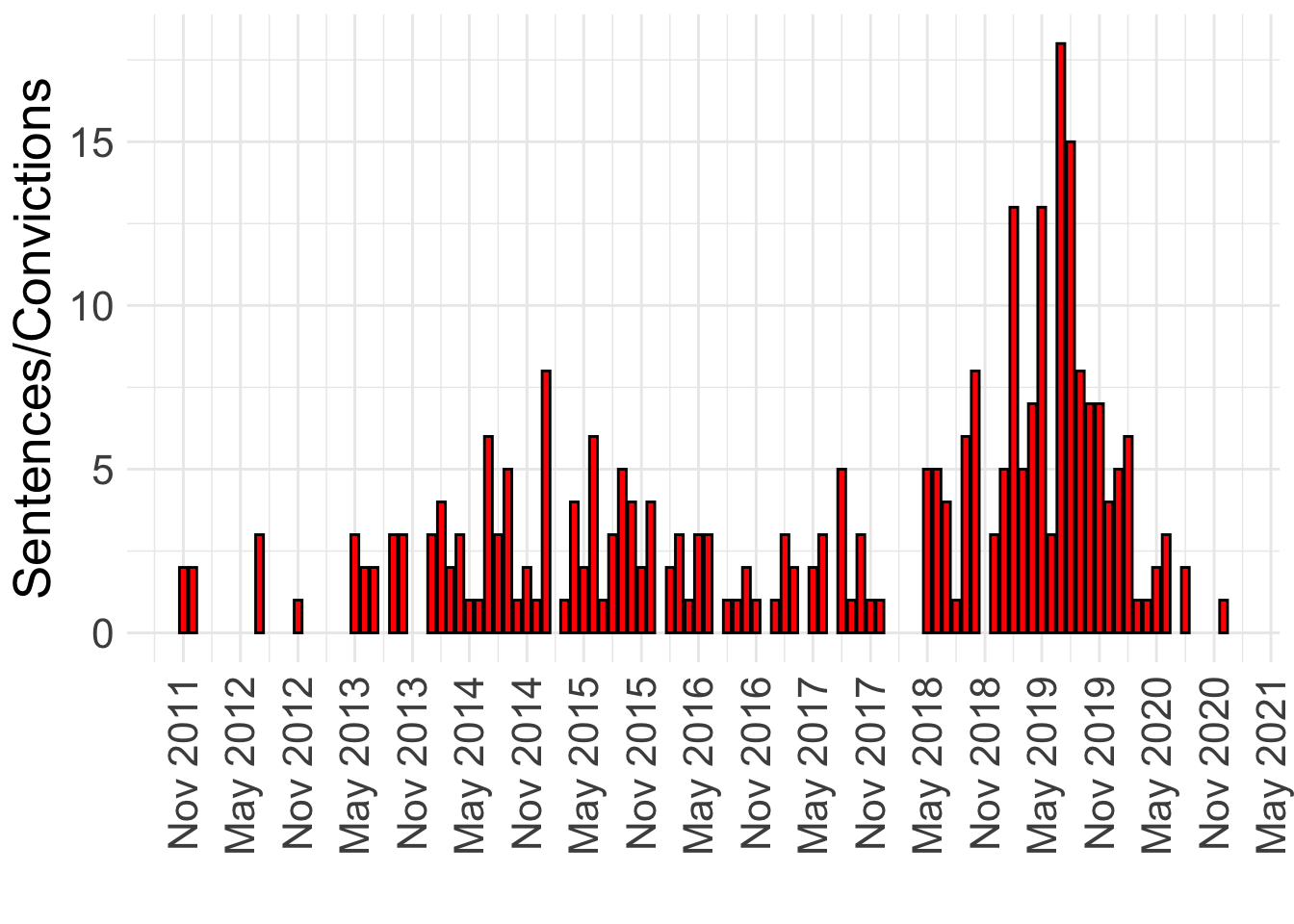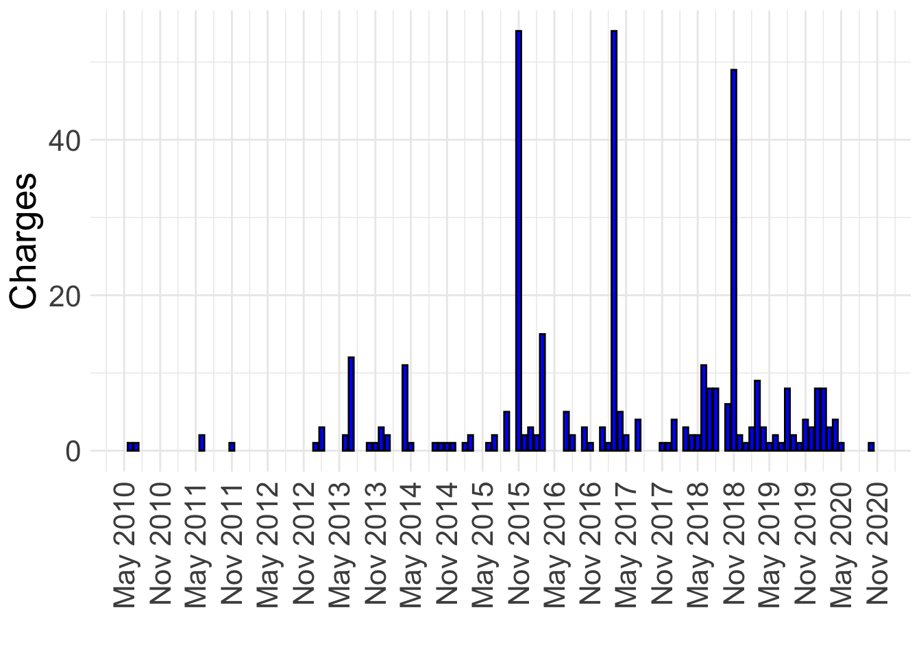 The dataset also contains, albeit inconsistently, with several missing values, dates of arrest, charging, indictment, and sentencing. These data are reflected in the bar graphs below.