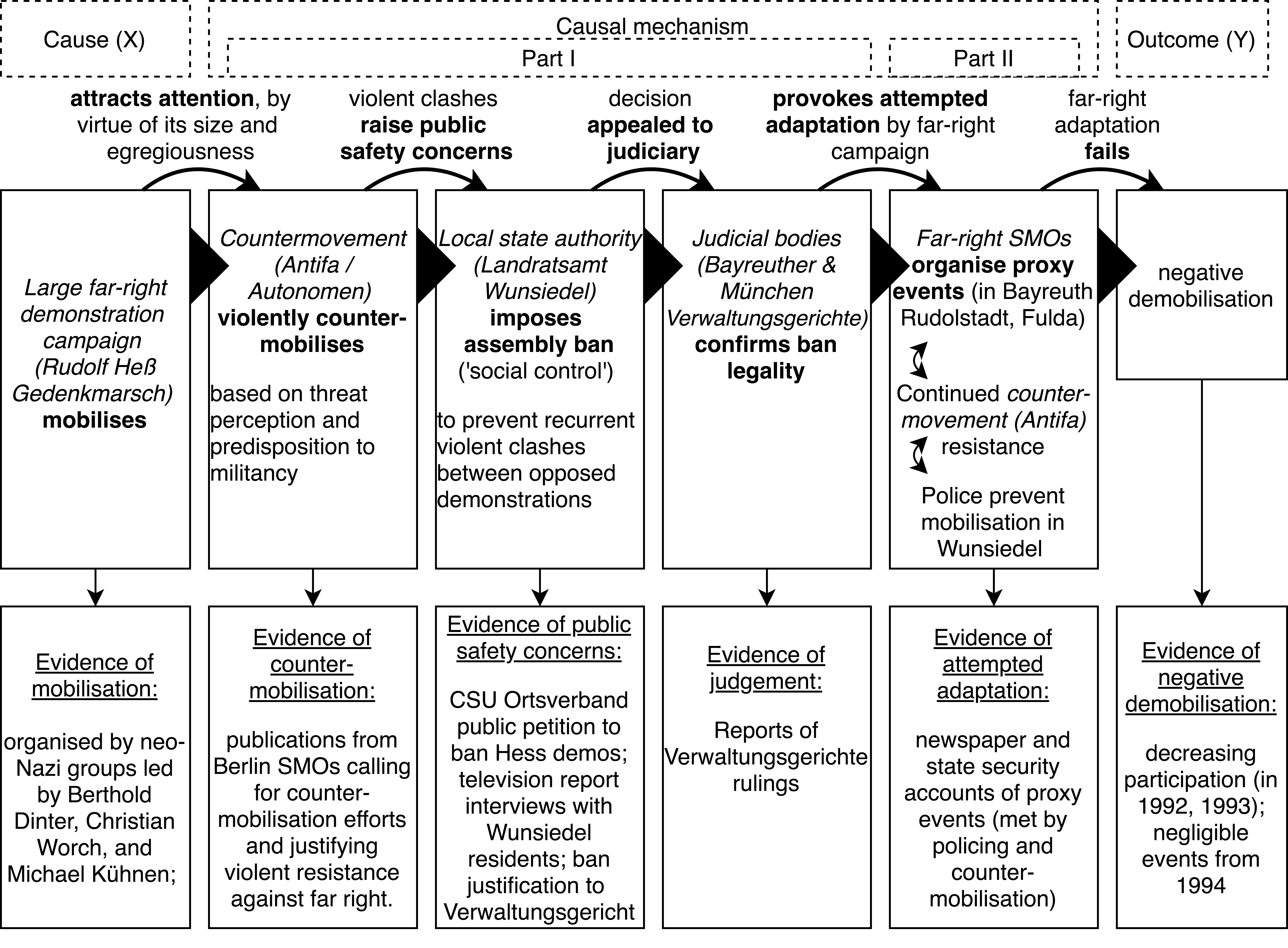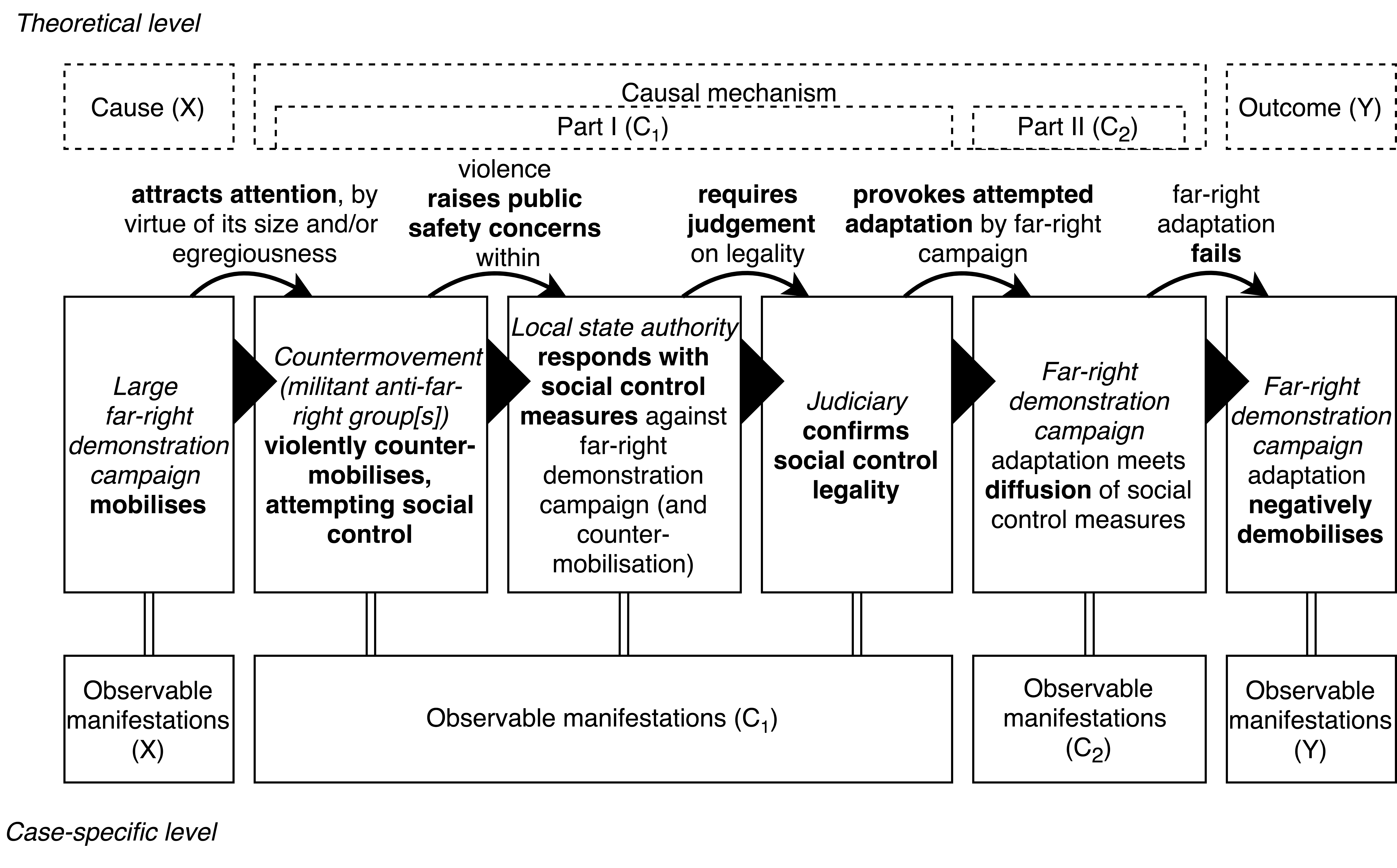 Scholarship on social movement lifecycles has focused on mobilization processes, with relatively less attention on the ends, demobilization. The intuitive connection between origins and ends has sometimes led to a conceptualization of demobilization as simply the failure to continue mobilizing, obscuring the distinct causal processes underlying demobilization. This article adds to recent studies foregrounding demobilization by studying the negative demobilization of large, far-right, demonstration campaigns. Using a subset from this population of cases—campaigns in Germany, England, and Austria between 1990 and 2015—the article applies qualitative comparative analysis (QCA) to this causally complex phenomenon. I find that demobilizing is conjunctural, with evidence of four patterns: closing opportunity, coercive state repression, civil countermobilization, and militant anti-far-right action. This article addresses an important—and conspicuously ubiquitous—population of cases, far-right demonstration campaigns and presents findings that reflect on critical issues in the study of far-right sociopolitics.